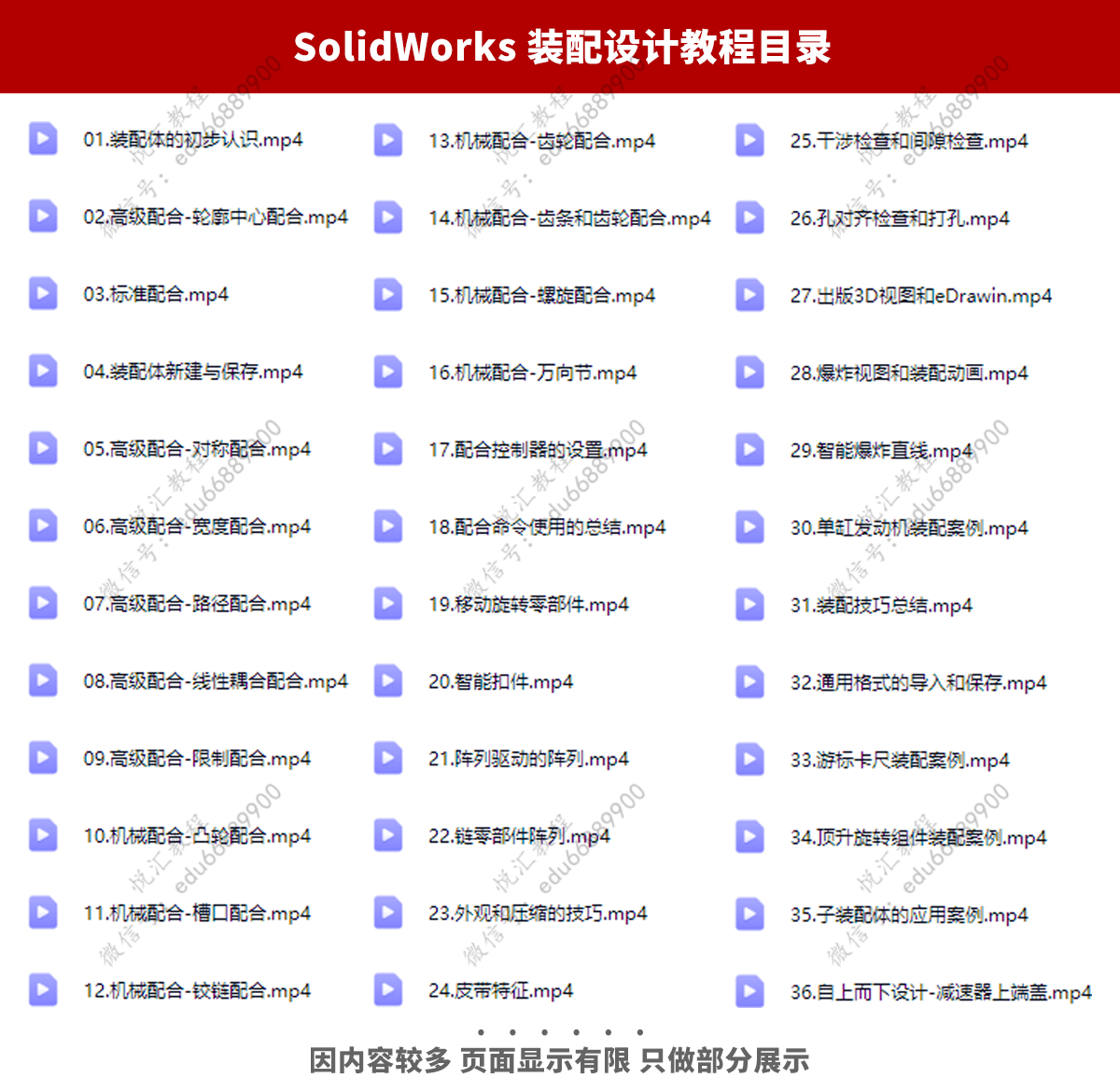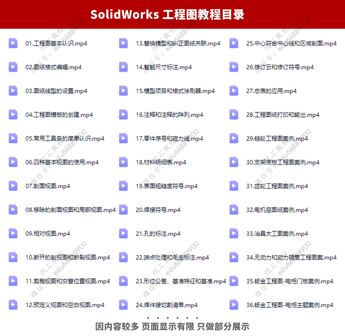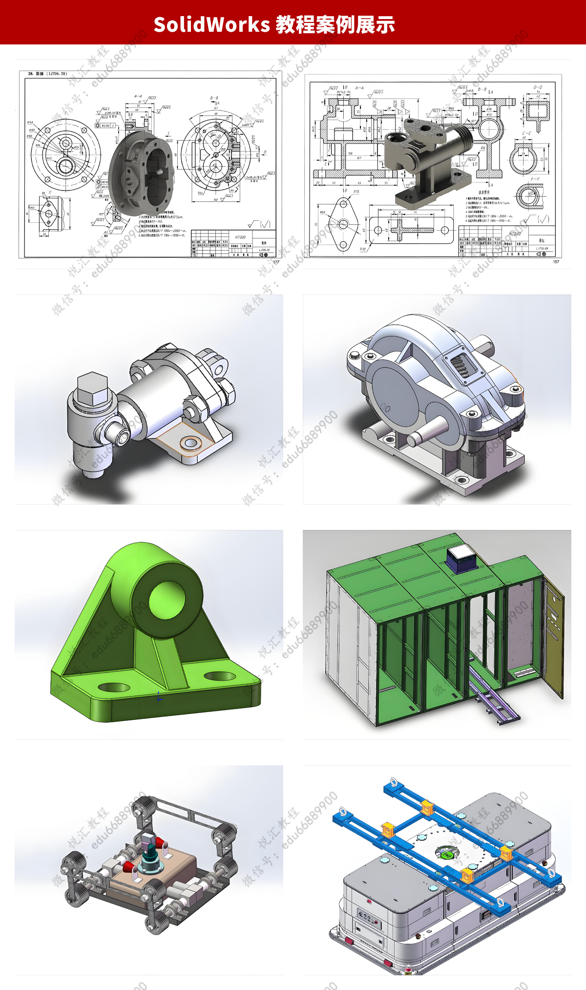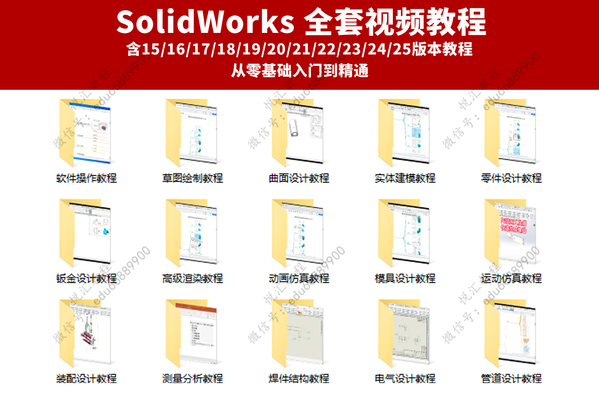 教程内容涵盖了学习SolidWorks所需的全部流程!包含草图绘制、零件建模、看图/识图、建模技巧、曲面造型、装配体设计、工程图技能、钣金设计、动画仿真、模具设计、焊件设计等内容,轻松万层各种工厂零件实物画图建模设计!
