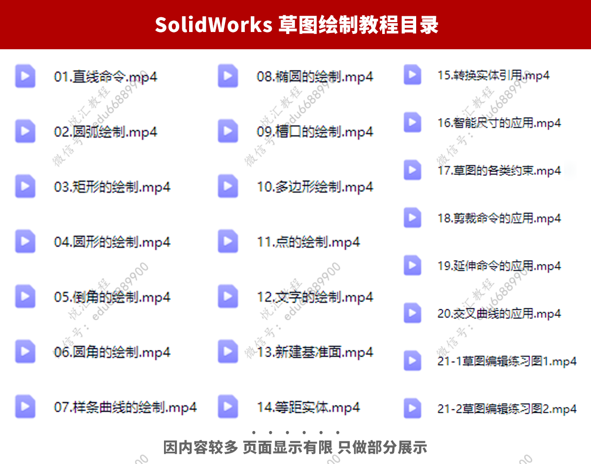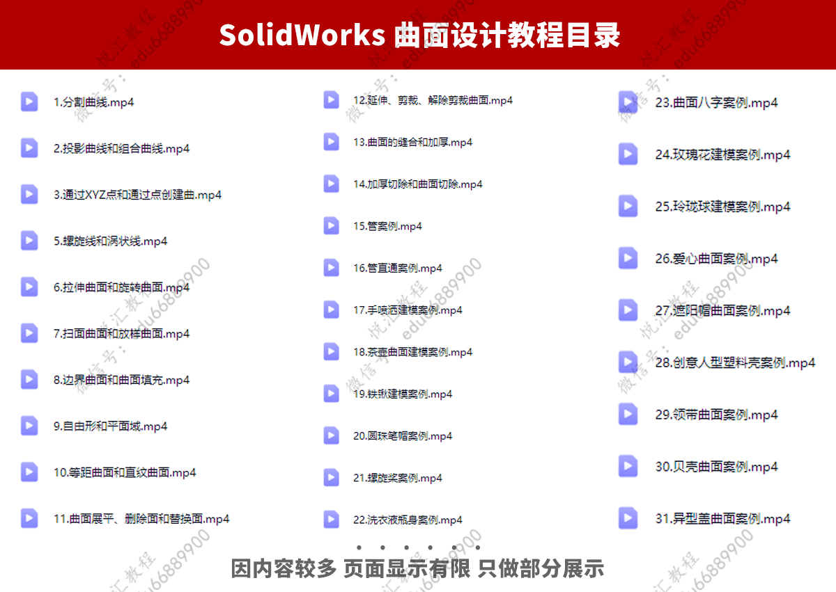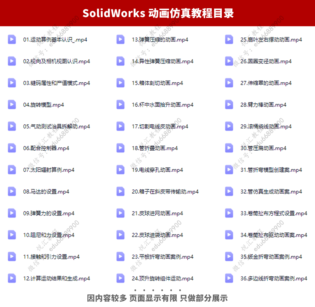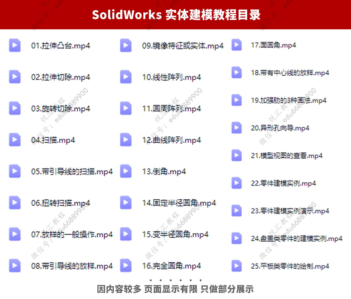 教程内容涵盖了学习SolidWorks所需的全部流程!包含草图绘制、零件建模、看图/识图、建模技巧、曲面造型、装配体设计、工程图技能、钣金设计、动画仿真、模具设计、焊件设计等内容,轻松万层各种工厂零件实物画图建模设计!