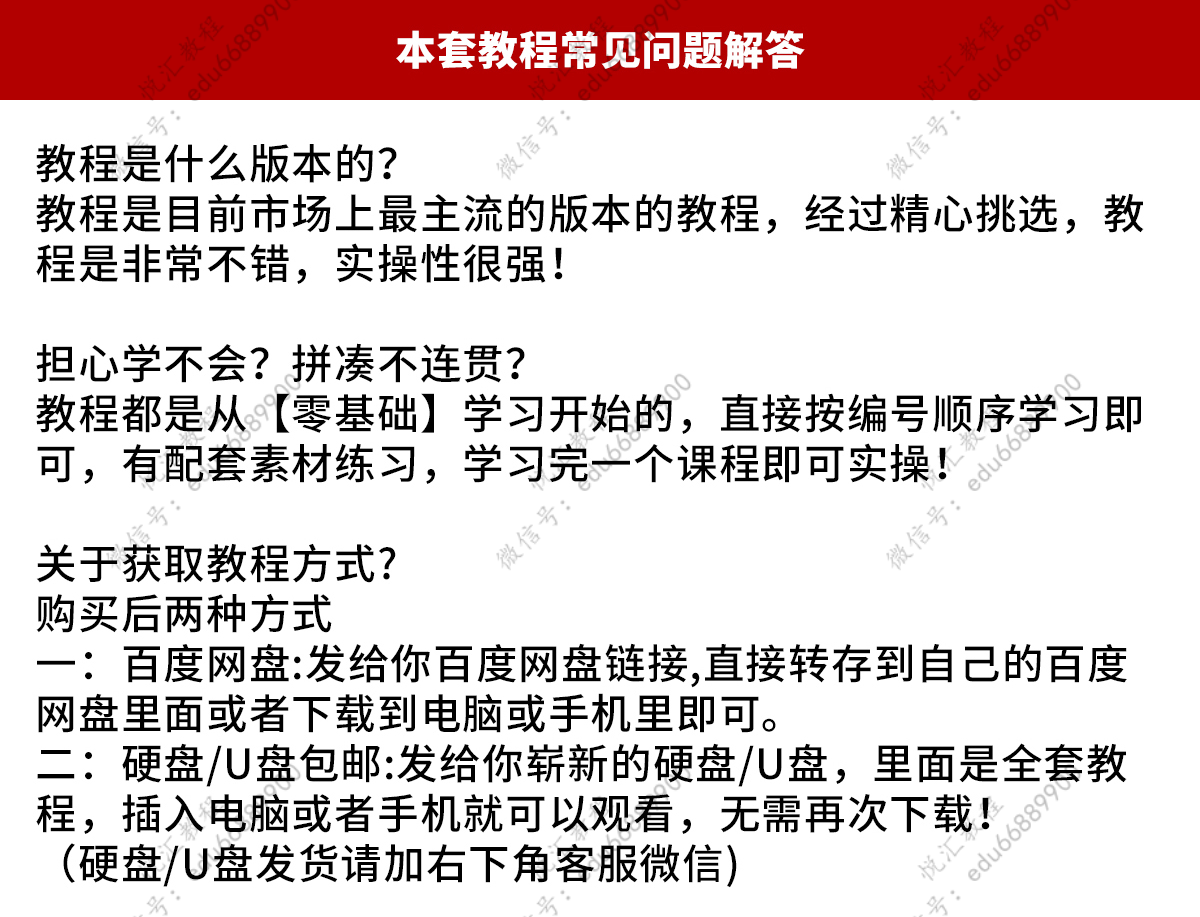 教程是一套系统的,0基础自学教程,包含初级入门、中级提高、高级进阶以及实战演练四个部分,课程采用通俗易懂的语言进行讲解,这种大白话的方式让每个学员一听就懂,一看就会,视频教程在拍摄过程中,都是采用专业的单反摄像机高清聚焦拍摄,且拍摄角度非常到位,细节可以通过进度条反复观摩放大,效果甚至比现场培训更好!在手机、电脑、平板,上都可播放使用,让您轻松在任何环境下,随时随地想学就学!